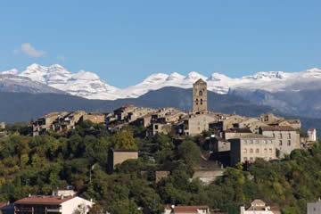 Olsón. Sus cuatro barrios (Plaza Baja, la Fuente, Samper y Solano) se agrupan en torno a un promontorio rocoso en cuya cima existió un castillo (S. XI) del que hoy no quedan restos. Iglesia de Santa Eulalia (S. XVI) conocida familiarmente como la catedral de Sobrarbe y declarada Monumento Nacional.